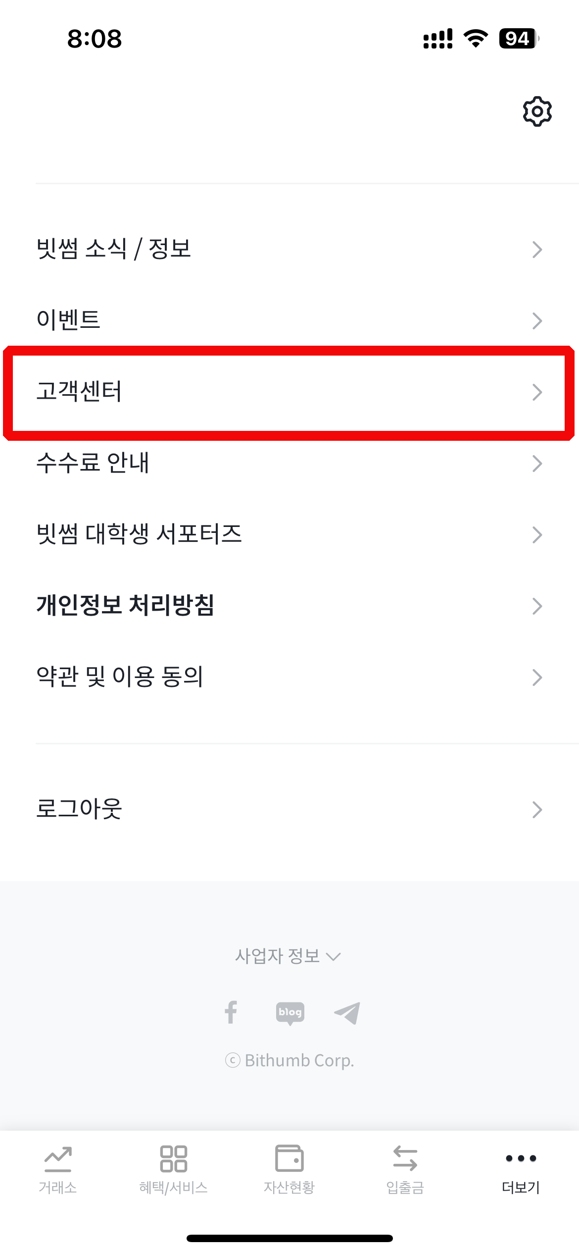 빗썸 앱을 실행 후 우측 하단에 있는 '더보기' 버튼을 눌러