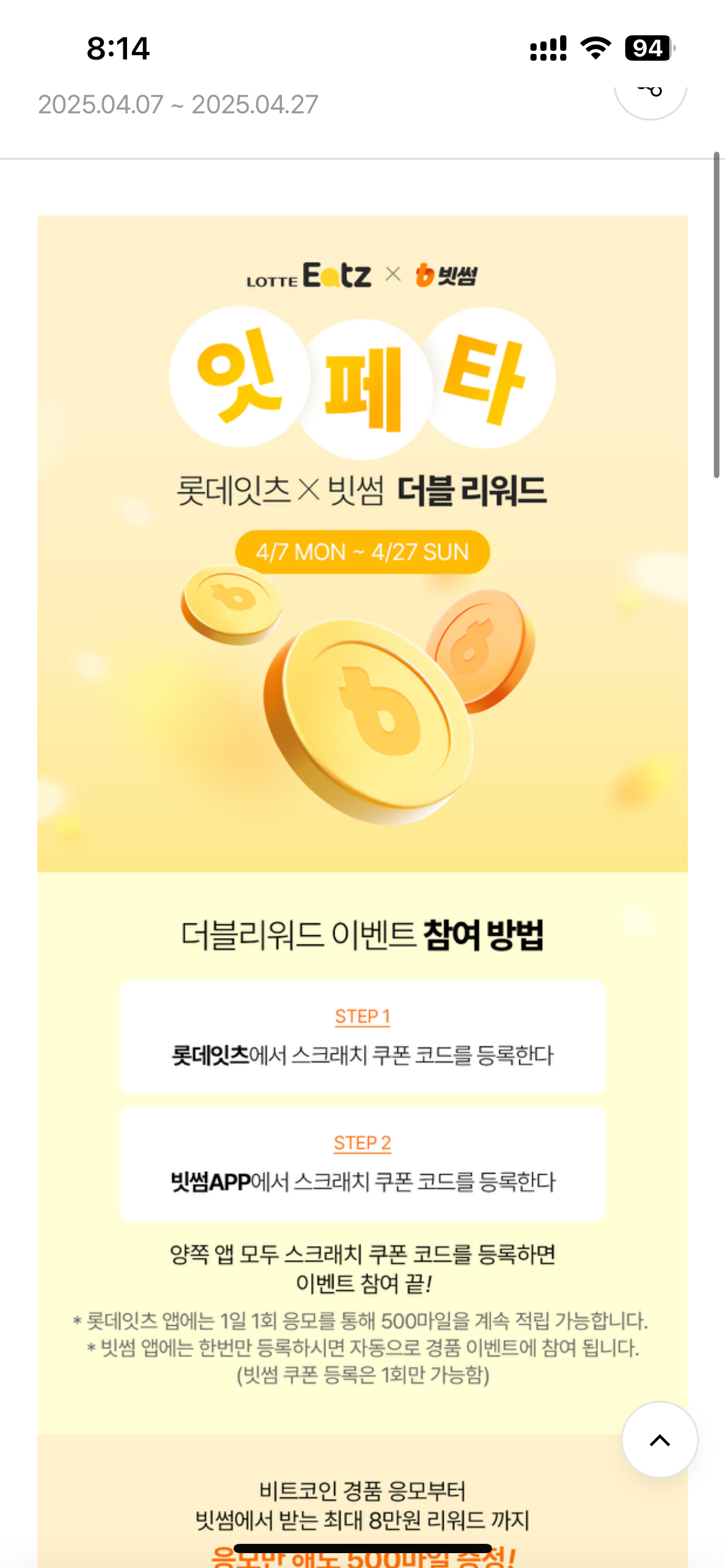 그 아래에 있는 롯데잇츠 x 빗썸 더블 리워드 이벤트로 들어가야 한다.