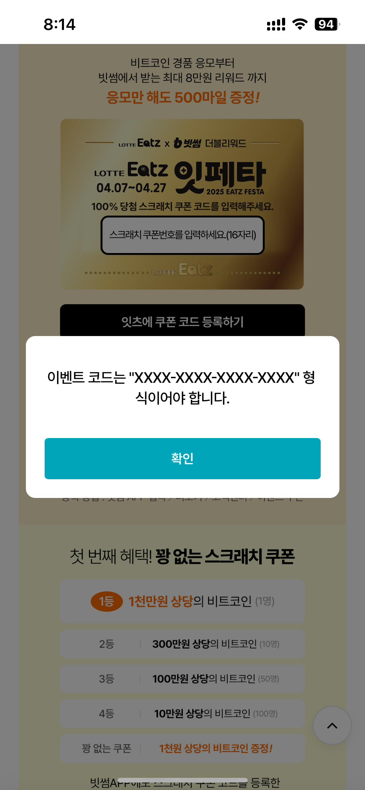 - 이벤트 참여는 스크래치 쿠폰으로 제공되는 쿠폰코드를 롯데잇츠 앱과 빗썸 APP 모두 등록 시 완료됩니다.