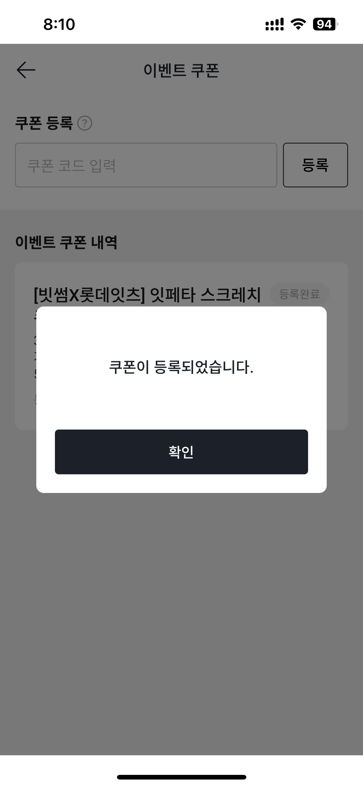 '쿠폰이 등록됐습니다'라고 뜬다.