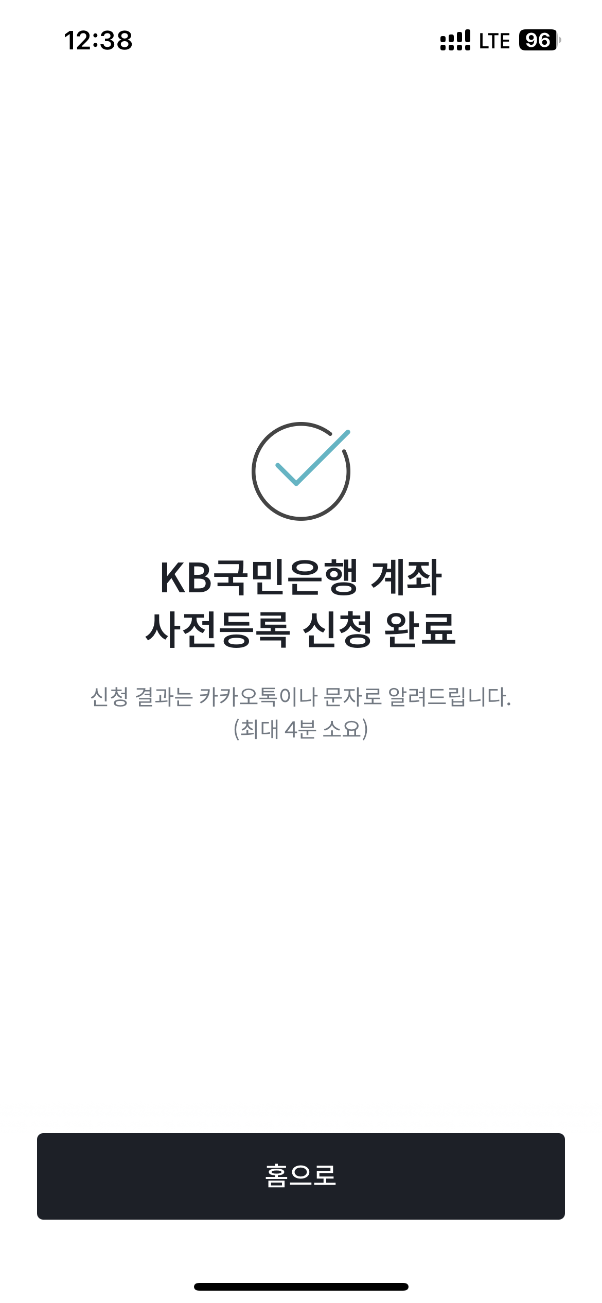 계좌입력 후 다음으로 넘어가면 kb국민은행 계좌 사전등록 신청 완료라고 뜨고