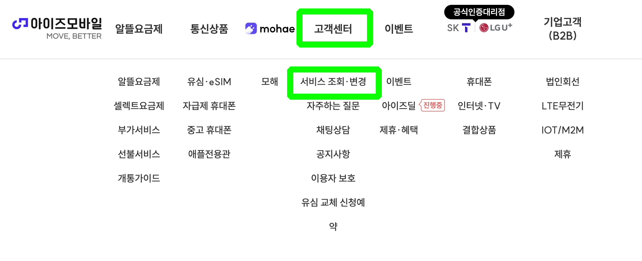 여기를 클릭한 후, [서비스 조회/변경] 메뉴를 클릭한다.