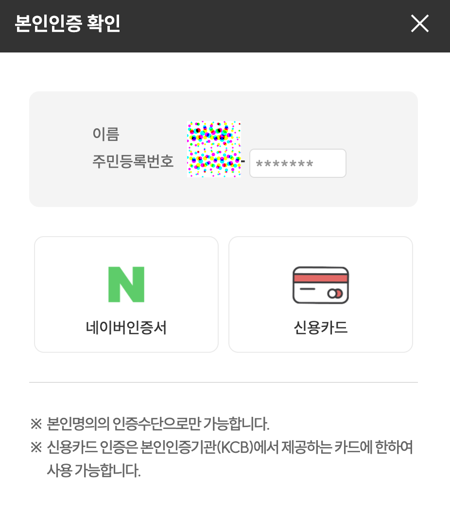여기서 주민등록번호 뒷자리를 입력하고, 인증 방법을 선택해야 한다.