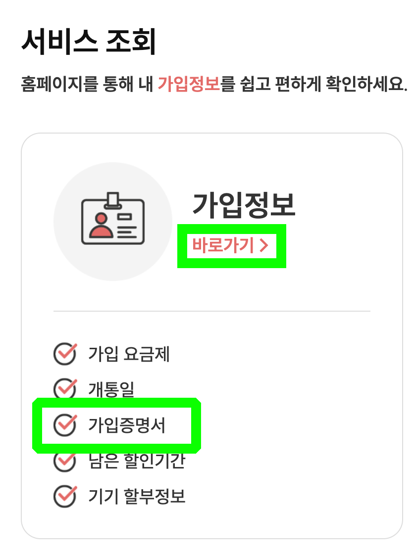 서비스 조회 변경 페이지에서 '가입정보' 항목을 찾아 '바로가기' 버튼을 클릭한다