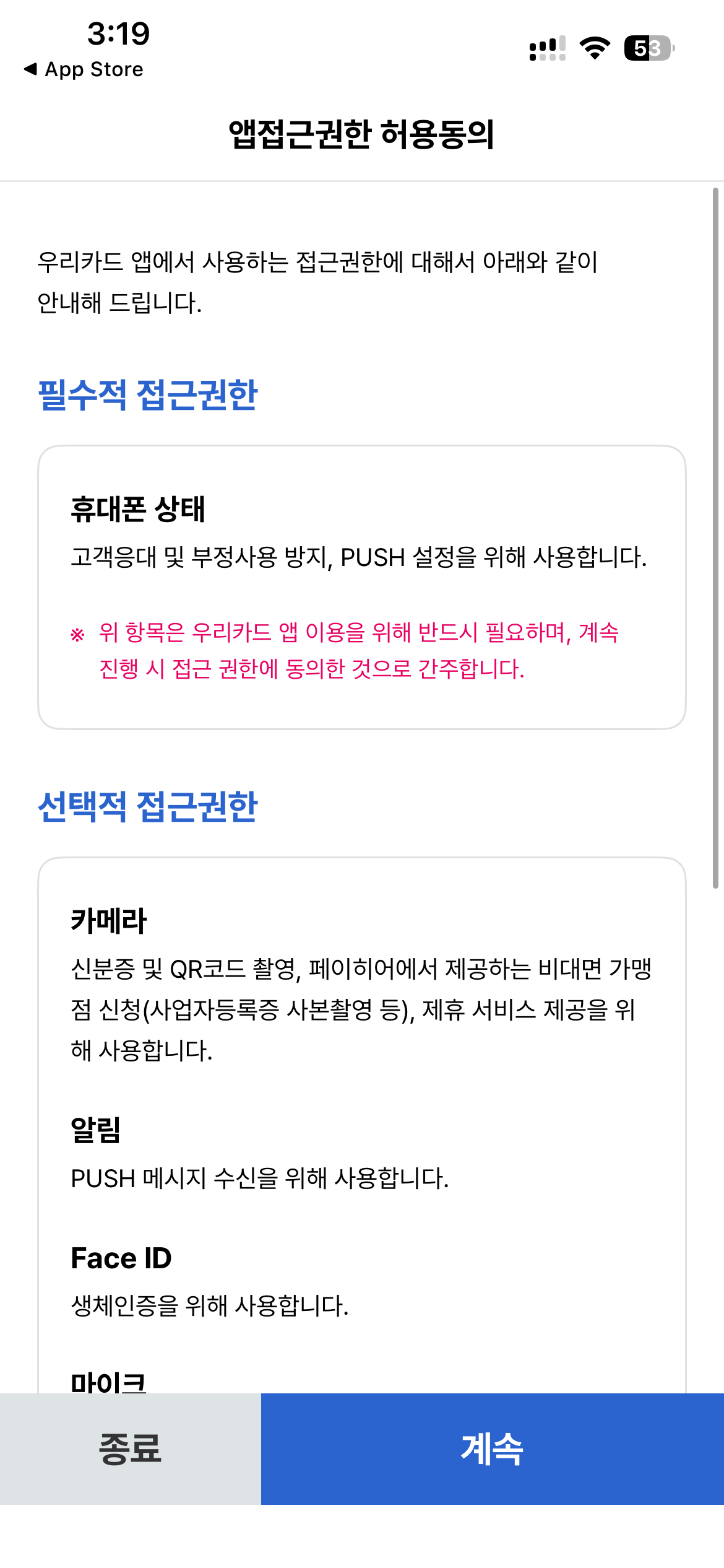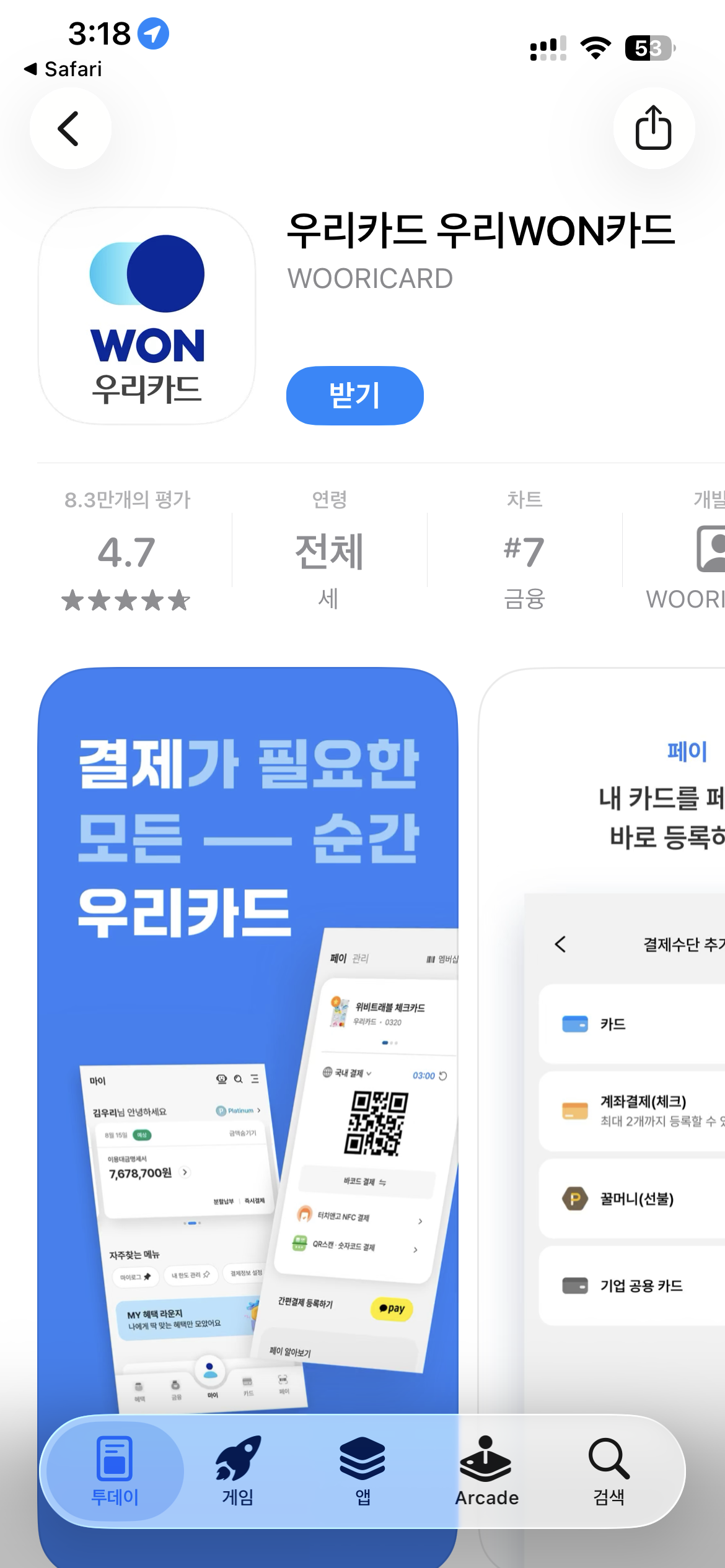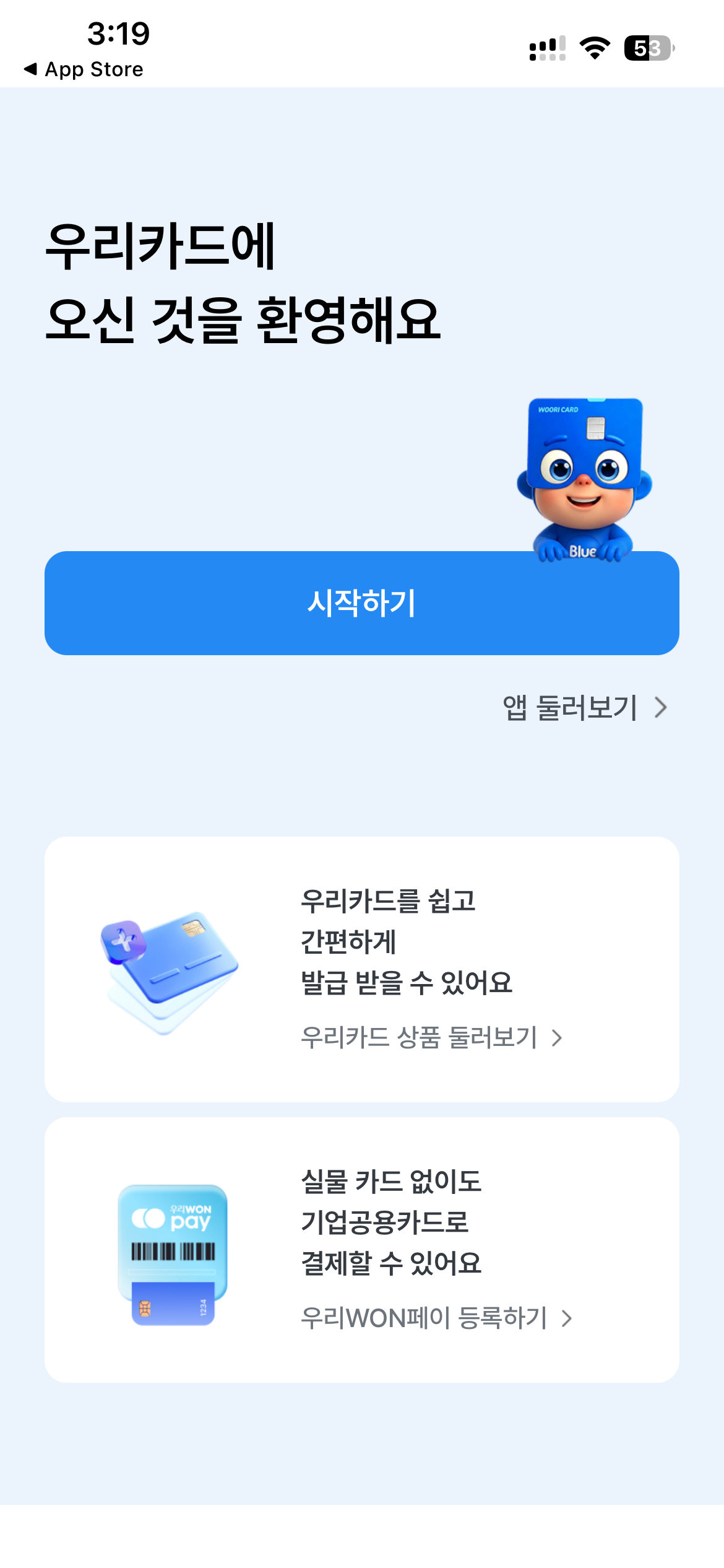 우리카드 발급을 받으려면 우리WON카드 앱을 설치해야 한다.
