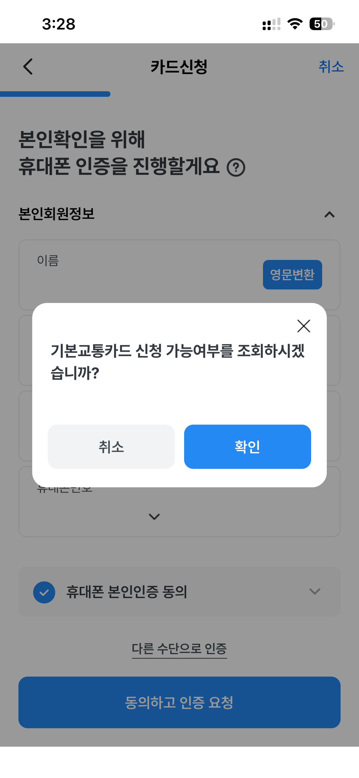 기본교통카드 신청 가능여부를 조회하시겠습니까?